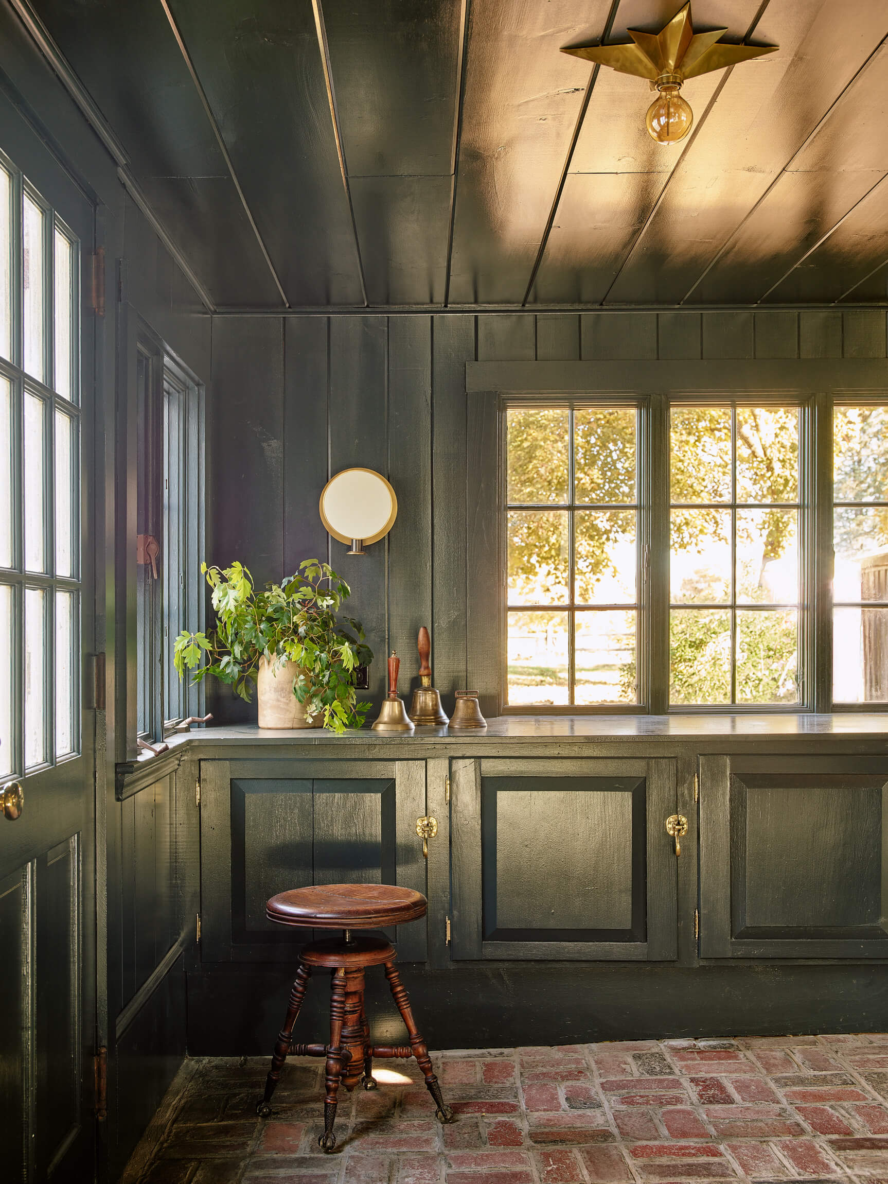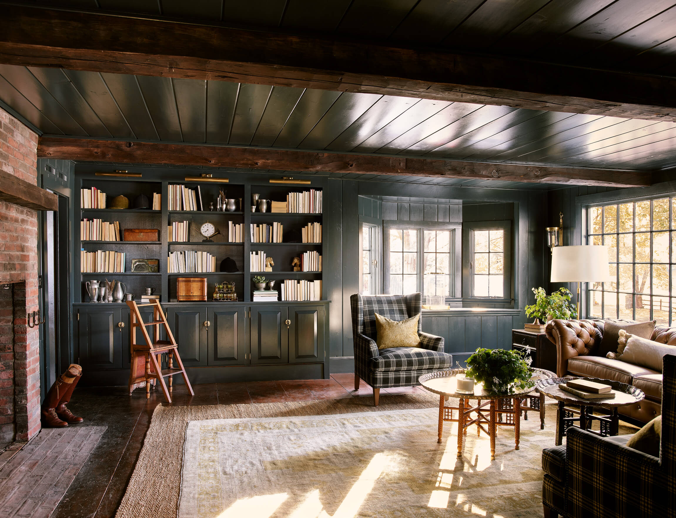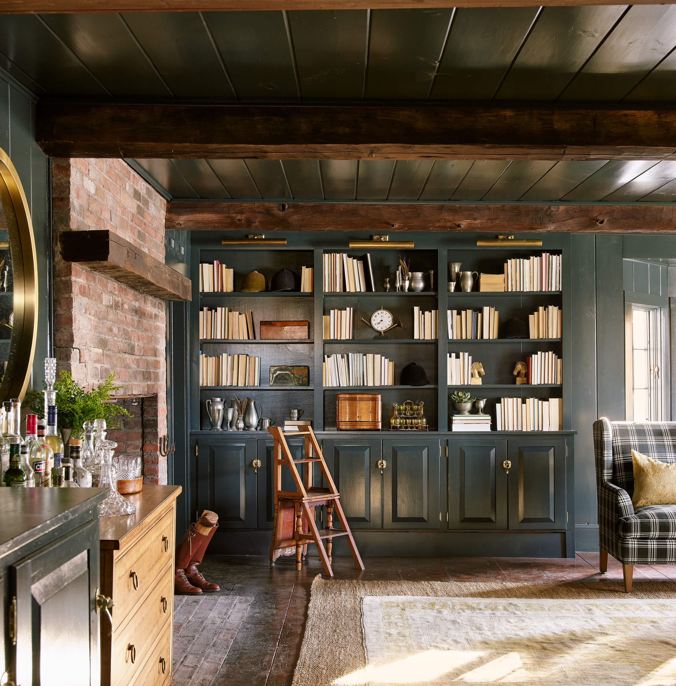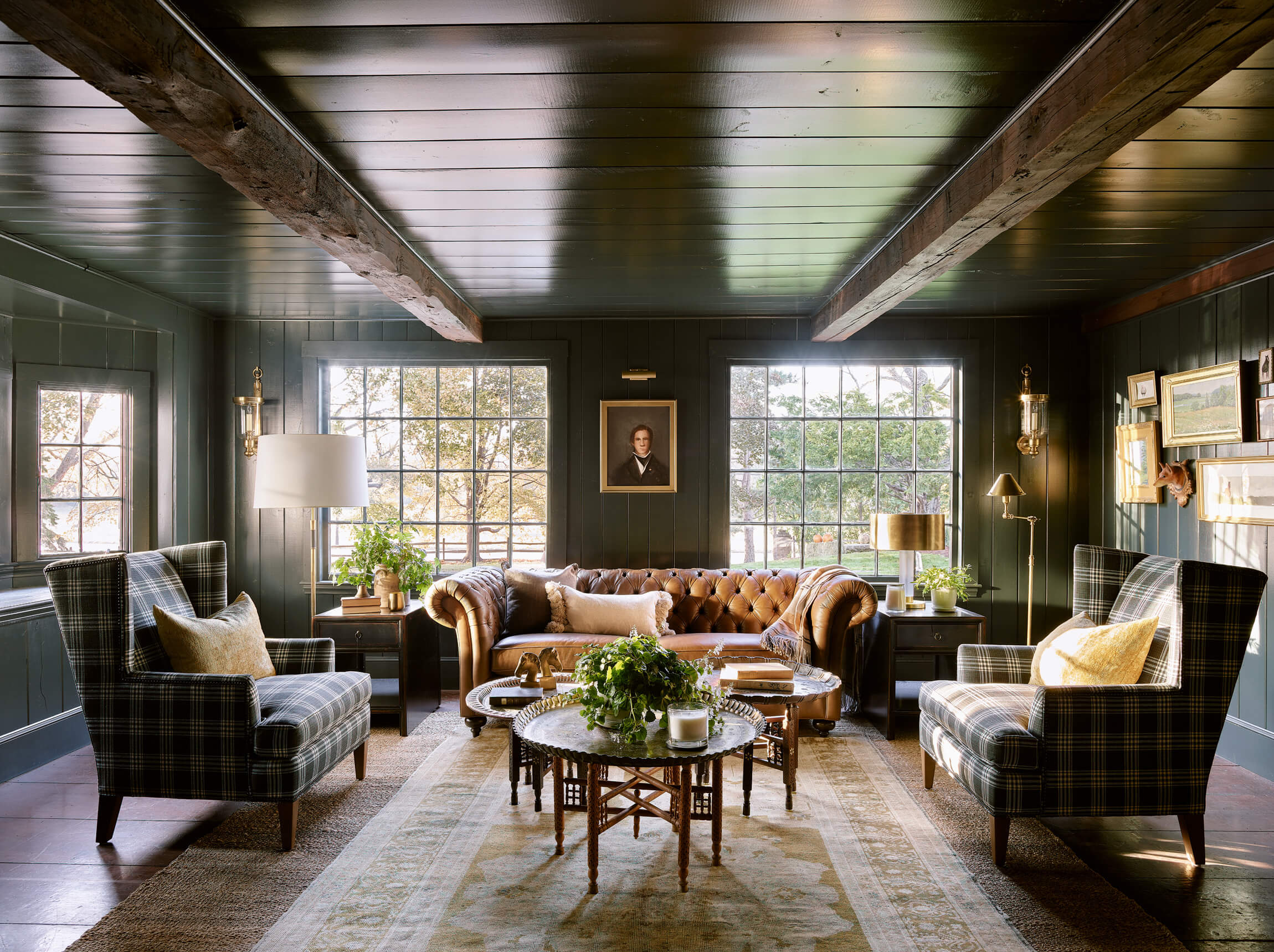 The Living – Dining space had minimal renovation but the addition of a custom mural of the property adds a touch of history. The Club Room is transformed with a moody green paint and a whole layer of lighting.