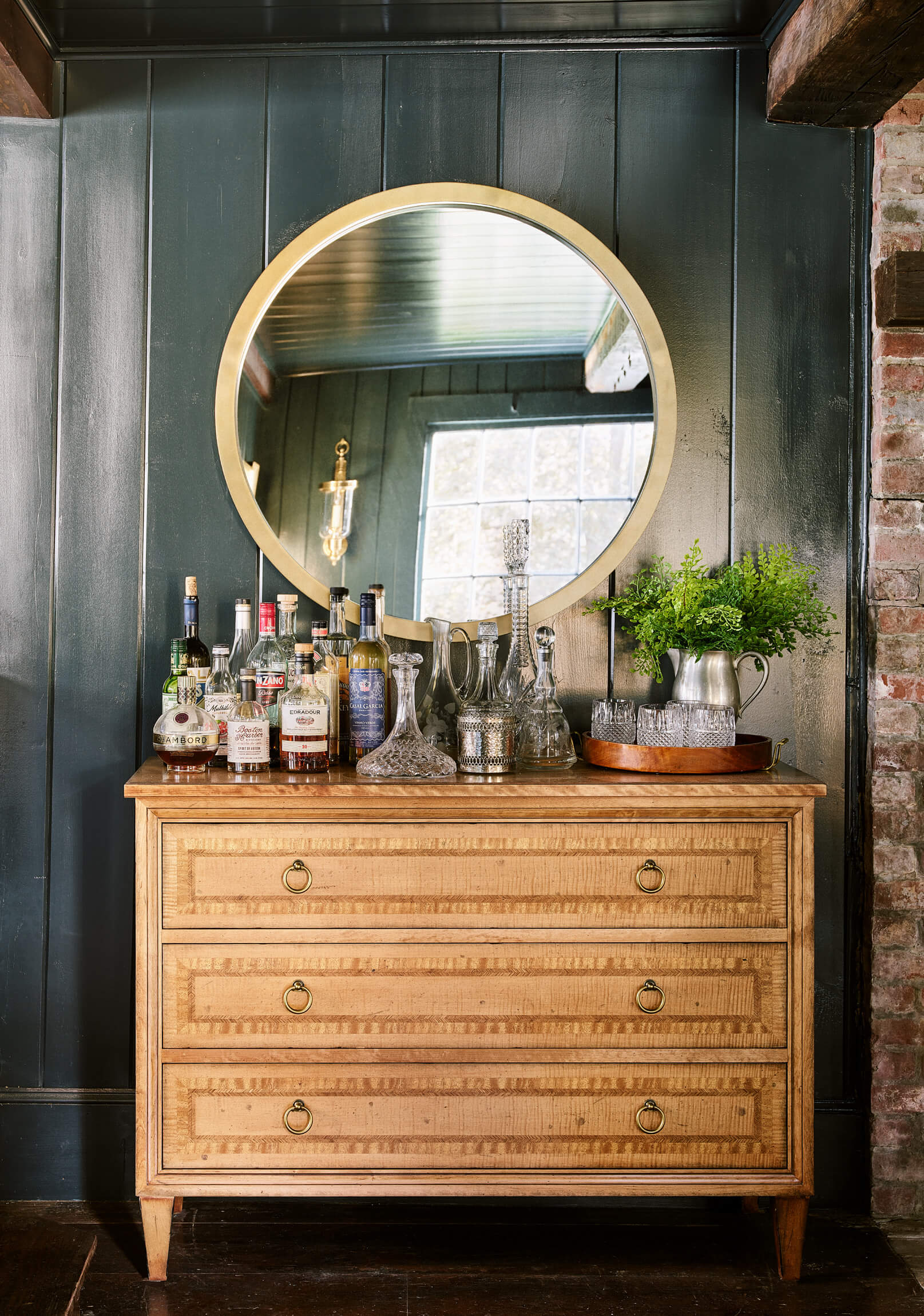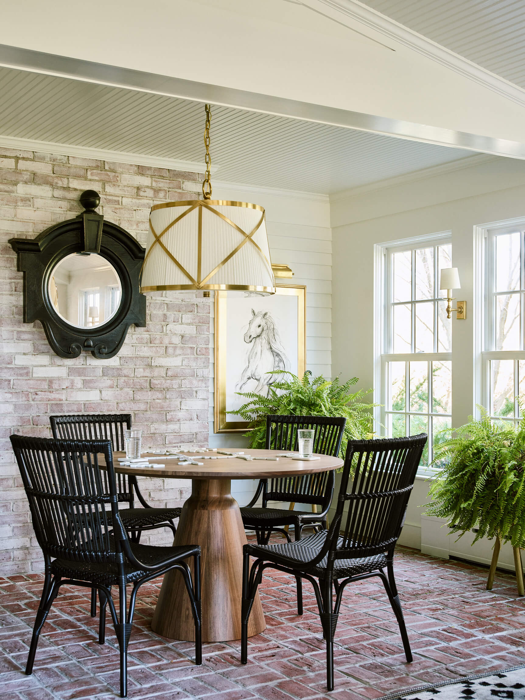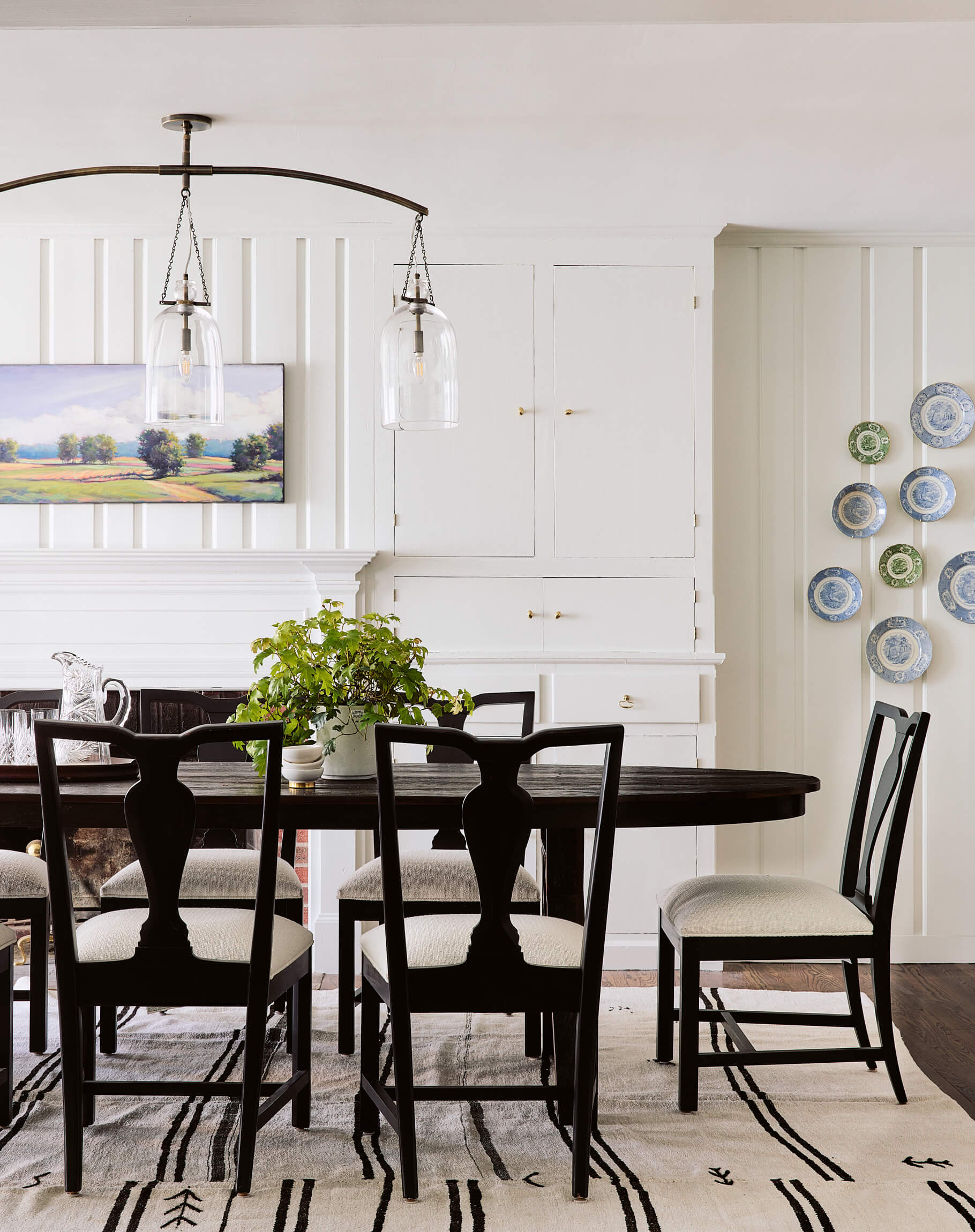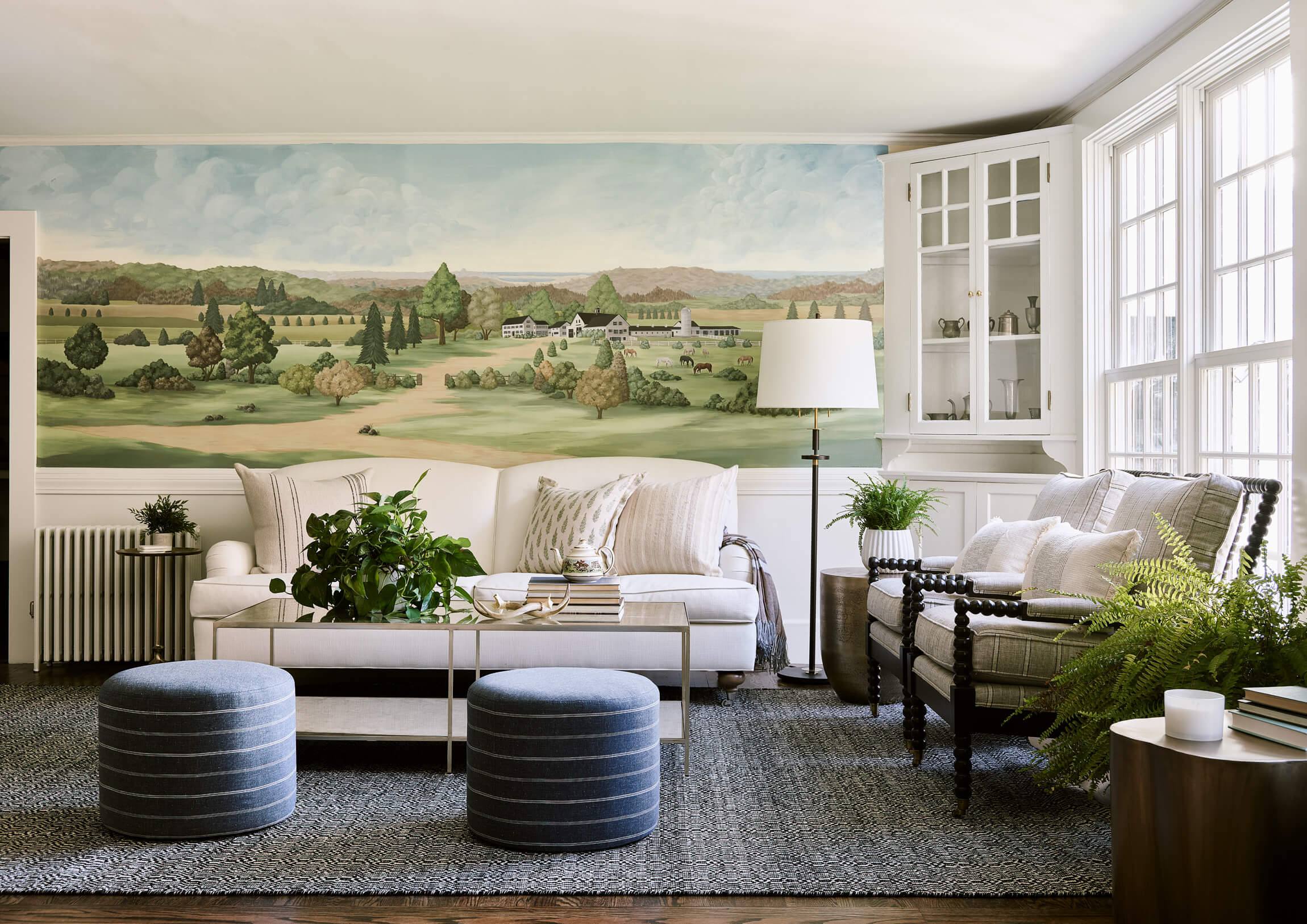 The Living – Dining space had minimal renovation but the addition of a custom mural of the property adds a touch of history. The Club Room is transformed with a moody green paint and a whole layer of lighting.