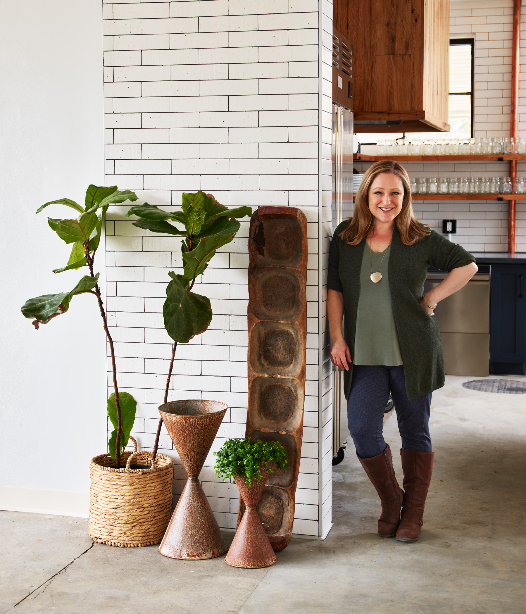 The new black metal garage doors gave off an industrial vibe so to continue on that theme that we used painted brick, tiling the walls from floor to ceiling, installed blue painted cabinetry for some rich color and utilized reclaimed wood for the island and vent hood. The center chandelier we conceptualized for function and form. The oval shape allows a camera to be mounted to the ceiling if the space is used to record cooking demos. Practical and pretty!